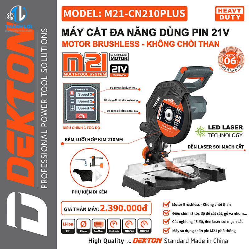 Máy cắt đa năng pin 21V Dekton M21-CN210PLUS là dòng máy chuyên dụng dành cho thợ cơ khí, nội thất và nhôm kính. Với thiết kế mạnh mẽ, lưỡi cắt lớn 210mm cùng động cơ không chổi than, máy đáp ứng tốt nhiều nhu cầu cắt khác nhau từ dân dụng đến chuyên nghiệp.