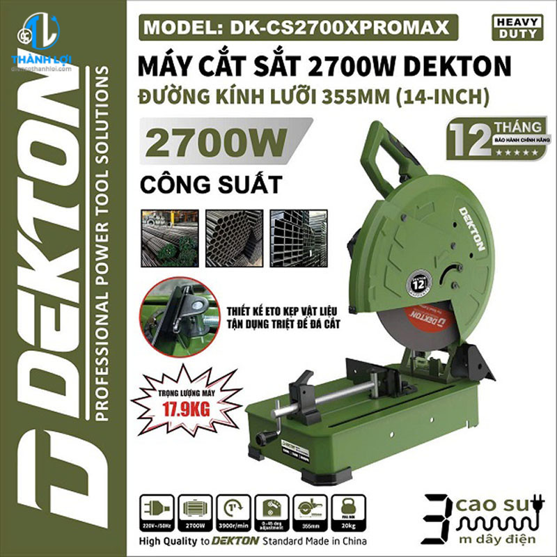 MÁY CẮT SẮT DEKTON DK-CS2700XPROMAX được phân phối tại ĐIỆN CƠ THÀNH LỢI. Những sản phẩm do chúng tôi cung cấp cam kết 100% chính hãng, có tem chống giả rõ ràng, chất lượng ổn định và có chế độ bảo hành tốt nhất thị trường.